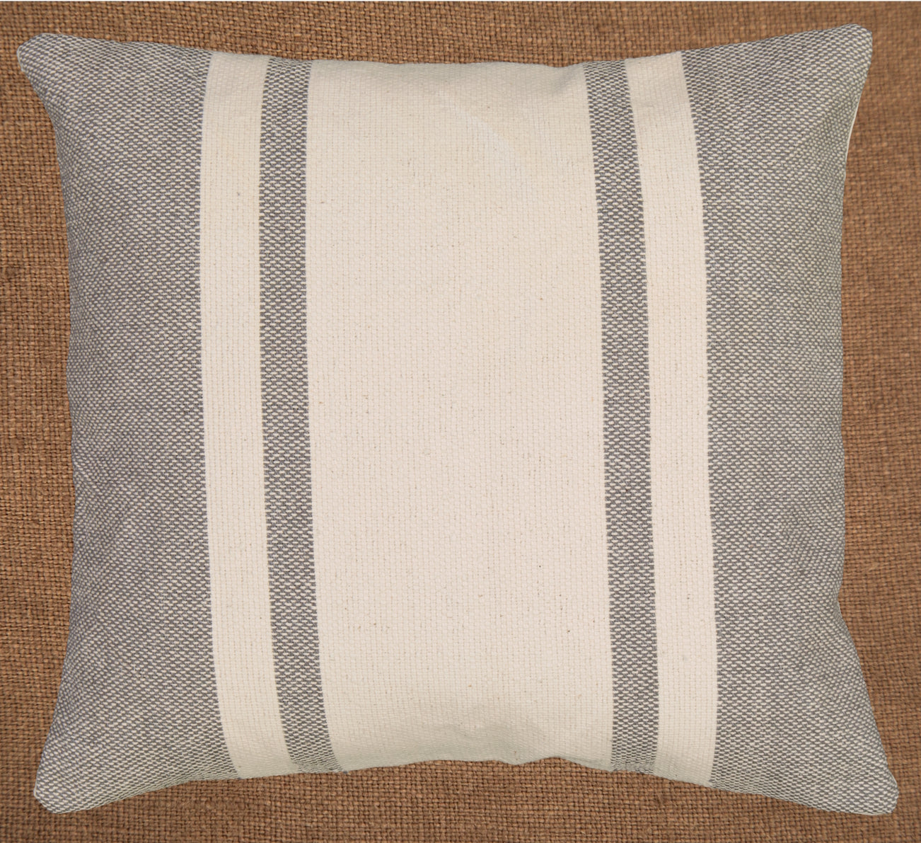 Hand woven cushion cover front with a Provencal stripe - Charcoal/Nat with a cotton fabric back including a YKK zip .