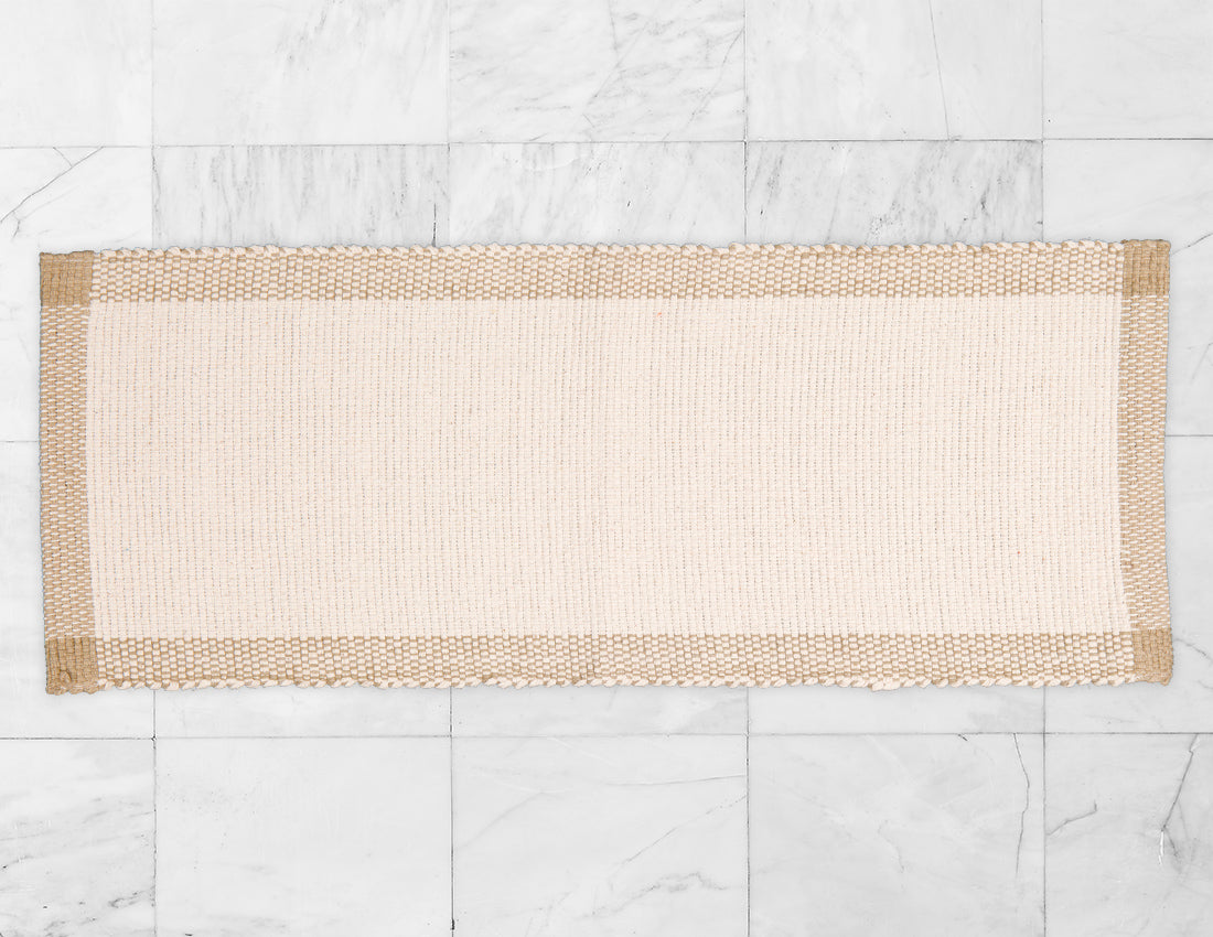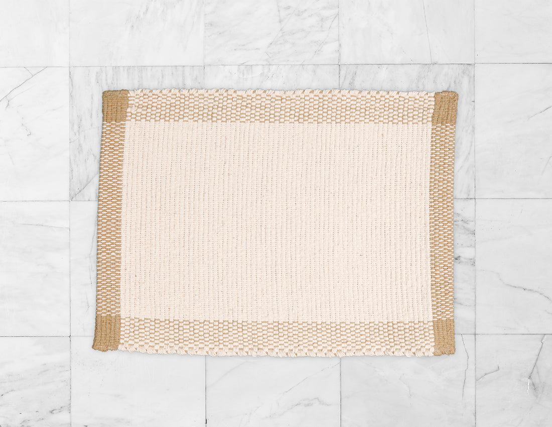 Hand woven cotton placemats and table runners in cotton. They are woven in our pebble weave with a natural background and a jute border.